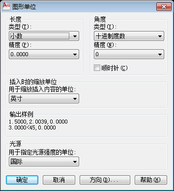 我们选择acad.dwt这个样板,新建一个图形。输入UN命令或者通过菜单栏中“格式>单位”来查看一下图形的“缩放单位”:
